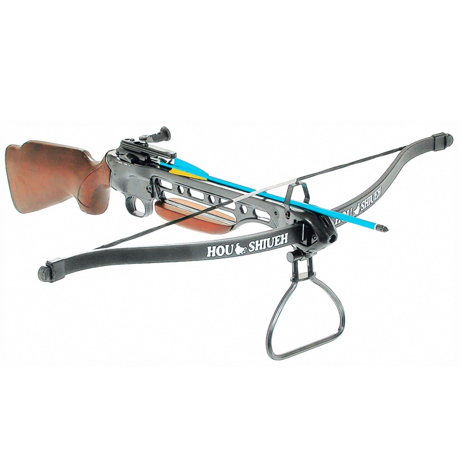 Fucile Balestra Man Kung modello MK150. L'arco è in fibra di carbonio con corde in acciaio, mentre la struttura è realizzata in alluminio con il calcio in legno, tutto ciò garantisce una grande compattezza e leggerezza.