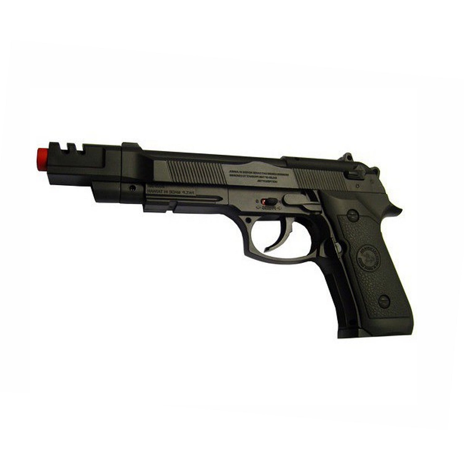 Pistola a co2 marca Win Gun mod. Beretta 92 canna lunga (C 302LB). Struttura in abs, cal. 6mm. Slitta 20 mm sotto la canna e bomboletta co2 nell'impugnatura.