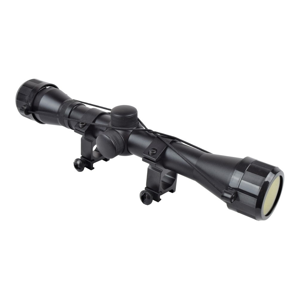 Ottica 4X32 Lungo colore nero. Ideale per fucili da softair. Dotata di attacchi per slitte weaver.