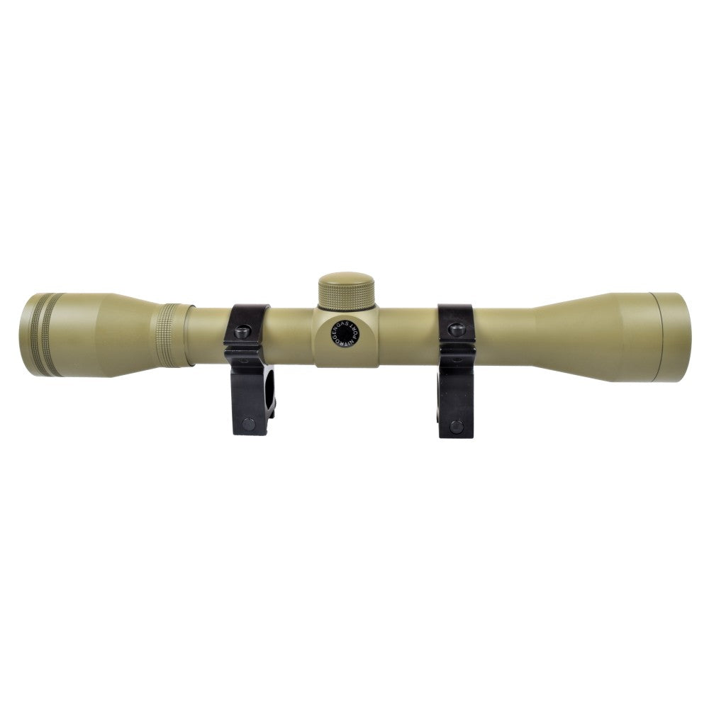 Ottica 4X32 Lungo colore TAN. Ideale per fucili da softair. Dotata di attacchi per slitte weaver.